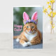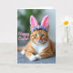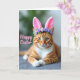 This card shows a relaxed ginger tabby with amber stripes and a white chest and paws, lying down with its front legs gently crossed as if posing for a sweet spring portrait. Soft pink bunny ears sit on its head, and a small crown of tiny lavender flowers adds a tender, friendly touch 🐰. The cat’s green eyes look straight ahead with a calm, affectionate focus, like it’s sharing a quiet moment with someone close. Light falls softly across the fur, bringing out the smooth texture and the fine white whiskers fanning from its muzzle. Behind the cat, the background fades into blurry washes of leafy green and muted grey, keeping the attention on the face and ears. A short Easter greeting appears over the image in rosy pink lettering, placed across the upper area without covering the eyes 🌷. The floral accents are clustered near the base of the ears, with lilac tones standing out against the warm orange coat.