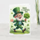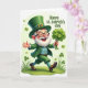 This card shows a smiling leprechaun-like character posed mid-step, as if he’s dancing toward you with an inviting arm outstretched. He has a round, open-mouthed grin, rosy cheeks, round glasses, and a full white beard that softens his face in a friendly, almost flirty way 💚. His outfit is layered in shades of green, including a tall hat with a gold buckle, a fitted jacket, and matching breeches. Blue-and-green striped socks peek out above brown shoes, each shoe finished with a shiny gold buckle that catches the light. In one hand he holds a big bunch of shamrocks ☘️, clustered thickly like a bouquet you’d give to someone you’re fond of. The background is a gentle green glow with small shamrocks floating around and a few thin blades of grass near the bottom. In the upper right, the words “Happy st. Patrick’s day” appear in darker green lettering against the lighter green background.
