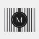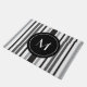 A stylish design of stripes in various shades of grey, black and white with a black circle. The initial monogram letter in the circle can be customised.