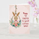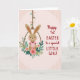 This card features a sweet, human-like rabbit 🐰 with soft brown fur, long upright ears, and gentle eyes that seem to linger warmly on the viewer. It sits nestled inside a rustic circular wreath, held like a natural swing, giving the scene a cozy, close-to-you feel. The rabbit wears a pink-and-white striped outfit, and its rosy cheeks add a shy, affectionate touch, like it’s waiting for a friendly hug. Around it, pastel pink flowers and leafy green sprigs form a ring that frames the figure like a floral embrace 🌷. The circle appears to hang from a braided, rope-like stem decorated with tiny multicolored leaf shapes that trail upward. The background is blush pink with a subtle texture and faint geometric lines that add depth without pulling attention away. On the right side, a celebratory message is set in warm red lettering, with a larger flowing line above and a smaller, simpler line beneath it. The wreath’s blossoms are pale pink, the foliage is soft green, and the rope detail is tan with little leaf accents in mixed gentle colors.