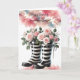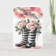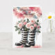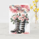 A beautiful birthday card featuring a whimsical pair of black and white striped boots filled with soft pink roses, swooshes of ombre colour accent the background. Customise as desired.
