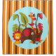 A cute shower curtain for kids who love zoo animals, safari animals, jungle animals, features a background of orange, white, and brown stripes with a blue circular with jungle plants, a giraffe, lion, and elephant!
