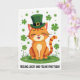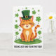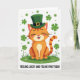 This card features a cheerful orange tabby cat centered on a rich green patch of grass, wearing an emerald top hat with a small gold buckle for a St. Patrick’s Day look ☘️. The cat’s eyes are gently closed, and its wide smile with a pink tongue and rosy cheeks feels like it’s sharing a private joke with someone close by. Warm orange fur with classic tabby stripes on the head and tail stands out against the greens, giving the scene a cozy, friendly contrast 💚. Four-leaf clovers and tiny shamrocks are scattered in the grass and drifting across the white background like confetti. The overall setting stays simple and bright, with lots of open white space that keeps the focus on the cat and the lucky greenery. Near the bottom, the text “FEELING LUCKY AND FELINE FINE TODAY” sits in a single line, set in green lettering beneath the illustration. The top hat tilts slightly above the cat’s round face, while clovers dot the foreground and background in small clusters.