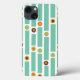 This phone case has a 1970s retro design of blue stripes interrupted by circles in brown, orange and green.