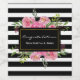 Elegant wedding full size wine labels, done in a black and white horizontal stripe pattern, with graphics of lovely pink peony flowers. A black rectangle text area, in the middle of the label, has custom white text. Personalise the text to read what you want, matching wine gift bag is available.