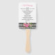 Stylish wedding program fan done in white, with black and white stripes, across the bottom and pretty pink peonies decorating the bottom front, of the fan. Personalise the text for your wedding day. Matching products are available.