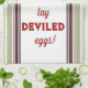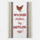 This kitchen towel has stripes along the length of both sides, a chicken and "Wicked chickens lay deviled eggs!" below it. Art Credit: RedPepper.