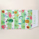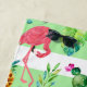 Tropical pattern with pink flamingos, tropical flowers and leafs, pineapple and more. Modern watercolors illustration with mint-green and white background layer.