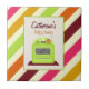 A kitchen tile featuring an illustration of a retro green stove over a background of pink, green, orange, burgundy, and gold diagonal stripes. Personalise with your name.