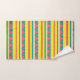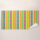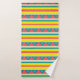 Towel Set with pink, yellow, white and blue stripes and blue and yellow triangles.