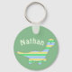Green and blue stripy cartoon dinosaur on cute Kid's personalised button keychain.