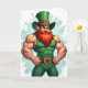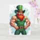 This card features a towering, muscular leprechaun centered in the scene, standing with hands on his hips as if posing for someone he wants to impress 💚. He wears an emerald-green tank top and matching trousers that cling to his broad shoulders and strong arms, giving him a larger-than-life look. A tall green top hat with a gold buckle sits above his fiery red beard and mustache, and his pointed ears peek out from the sides. His piercing blue eyes and furrowed brows add a teasing, confident edge, like he’s locking eyes with a close friend or a sweetheart just off to the side ☘️. Dramatic lighting creates sharp highlights along his chest and biceps, making his body look glossy and sculpted. The St. Patrick’s Day greeting appears near the top in bright green lettering, with a smaller line of text below in gold. Behind him, a light teal background is streaked with energetic white rays that fan outward from the center.