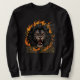 Digital illustration featuring a fierce lion's head with a detailed and realistic style. Surrounding the lion's head is a vibrant ring of flames. The text 'THE KING' is written in a bold