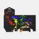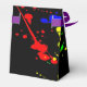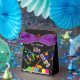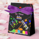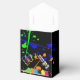 Black tent-style with purple ribbon favour box with an image on the front of red, orange, yellow, green and blue paint splatters, high-top sneakers in neon colours, cassette tapes, colourful sunglasses and the phrase “Stuck in the 80s” in neon letters. See the entire Tubular 80s Favour Box collection in the PARTY FAVORS section.