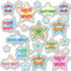 These motivational sticker designs feature star shapes, and sometimes the message "GREAT WORK!", in a variety of colours and styles. Stickers like these might be used by a school teacher or educator to encourage and motivate students who have done well on an assignment, test, quiz, or some other school work.