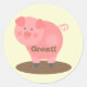 A reward sticker for students featuring an illustration of a pink pig standing in a mud puddle. Customisable brown text says "Great!"