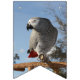 Pretty African Grey on a tree stand with her pretty grey feathers and red tail watching her surroundings outdoors against the blue sky and oak trees.