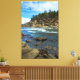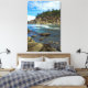 This vibrant, blue shoreline is accented by a think forest on top of a rocky cliff along with gorgeous ocean rocks in the foreground leading out to sea. Colourful and bright, this is the perfect decor for any home or office.