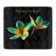 Stunning watercolor-themed digital art design of two plumeria flowers. The background is a solid black, and the flowers have shades of blue and yellow. The stylish yellow text says, "Aloha oukou" - a traditional Hawaiian greeting which means "Aloha to all of you." You can easily customise and change the wording if you wish. This eye-catching design on a decorative glass cutting board is sure to attract some attention at your next luau, or in your home kitchen.