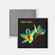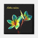 Stunning watercolor-themed digital art design of two plumeria flowers on a refrigerator magnet. The background is a solid black, and the flowers have shades of blue and yellow. The stylish yellow text says, "Aloha oukou" - a traditional Hawaiian greeting which means "Aloha to all of you." You can easily customise and change the wording if you wish. This eye-catching design on a square magnet is sure to attract some attention.