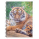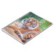 Close up photograph of a chilled out tiger relaxing on wood with green foliage behind.