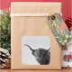 Photo sticker with a sturdy but funny Scottish Higland cow with big horns, long hairs in front of the eyes and the mouth half open in black and white / monochrome.