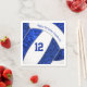 These volleyball themed birthday party paper napkins feature the realistic image of an abstractly oversized, stylised volleyball that has blue & white panels upon which you can customise the text - by katz_d_zynes