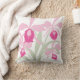 A bold floral flower pillow in shades of pink and green on a white background. Would look great in a summer room or bedroom. Original graphic print of a stylised Cattleya sympodial orchid by Sarah Trett. www.sarahtrett.com