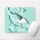 Stylised bird art on mousepads featuring a Nuthatch on swirl pattern branches and decorative leaves on light blue background.
