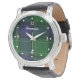 Stylish leather strap wrist watch, with the classic blue, green, and white clan Abercrombie tartan plaid pattern, on the face, with white numbers and dots for the hours. White custom text reads Abercrombie, and can be personalised to read what you want.