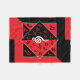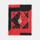A stylish fleece blanket featuring a musical design in an art deco style with a large treble clef in white with musical notes in red and black on an alternating black and red background.