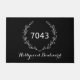 Large stylish black front door mat featuring a floral laurel wreath and your address. Text is fully customisable. Available in two sizes. From Heard_.