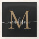 Stylish Black Gold Monogram Feminine Script Name Glass Coaster