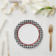 Stylish, preppy, and modern paper plates printed with a black and white houndstooth pattern, while the centre circle is white and outlined with red and black.