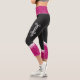 These black modern workout leggings feature an elegant and delicate white floral design on a dark magenta background on the waistband and on the legs.