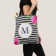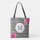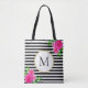 Stylish Black White Striped Pink Floral Monogram Tote Bag