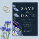 Set an elegant stylish modern tone for your wedding with this beautiful hand painted spring and summer floral blue save the date card with gold foil and blush blue elegant typography script on a navy blue background. Original artwork by artist Catherine Sweetman includes cornflowers, poppy, cosmos and forget me nots. Unique stylish wildflower meadow flowers ideal for a chic outdoor or garden wedding theme. Matching wedding supplies available in the elegant summer floral blue wedding suite collection