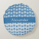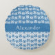 Trendy round accent pillow features Greek swirly repeating floral pattern in blue and white , with pattern in reverse on white with blue. Personalise with name or other special message.