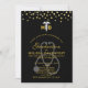 A invitation for a medical doctor graduation celebration. Designed with faux gold confetti dots along the top. A white caduceus symbol with the letters M D on either side. A grey stethoscope behind the party text.