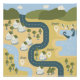 Cartoon map in flat style drawn with landmarks, mountains, road, sea, river, forest and houses