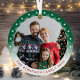 Stylish, colourful double sided, two photo, round ornaments. On the front side, this custom ornament design features your personal photo highlighted in a unique white and green gradient frame with delicate snowflakes. The designs modern typography displays your family name and the year or can be edited to read anything you like. The text is in a warm holiday red colour which also can be easily edited to any colour of your choosing. The back of the ornament fully displays your second photo. The perfect keepsake gift and tree décor for the holidays & Christmas.