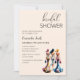 Modern and stylish Bridal Shower invitation featuring watercolor painting of three elegant, hourglass-shaped women wearing form-fitting and lightweight dresses of vibrant colours and patterns. Their hair styles and colour palettes differ and each carries a small backpack, adding a touch of casual charm to the scene.