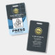 Colorful stylish blue shade waves are accentuated by an underlying global imprint at the top layer of the badge. Here lies an optional faux gold global city silhouette logo you can use. This is followed by your prestigious name, job title and a photo template to upload photos up to a size of 1,000 x 1,000 pix. Near to the base of the badge is a remarks caption "PRESS". You can change the caption to suit your needs. Just below this is the organization name.