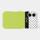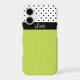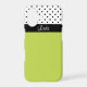 Add some fun and style to your phone with this custom name elegant apple green, black and white polka dots iPhone case! The case features a fun polka dot pattern with alternating green, black, and white dots, giving your phone a unique and stylish look. The case also has openings for all of your phone's ports and buttons, allowing you to have easy access to them while still keeping your phone safe. The case is made with a durable and protective material that is sure to keep your phone safe from scratches, dents, and other wear and tear. With this acid green case, you can make a statement and elevate your look while also keeping your phone safe.
