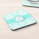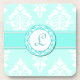 Pretty monogram coasters, with a light aquamarine and white damask background. A bold aquamarine stripe runs across the middle, with a decorative round disc, in the middle, for a one letter monogram. Personalise the initial to suit your needs. Great gift idea.