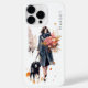 Chic, stylish woman with floral bouquet. She is walking her dog through the city. This phone case is customisable with a name on the upper right side in a dark grey sans serif font.