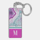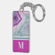 Stylish Teal Magenta Pink Agate Stone Monogram Keychain. Agate crystals and geodes continue to be a favourite trend! This print features and up close image of a teal or turquoise and purple pink or fuchsia geode stone, complete with little crystals and white banding. Accented with vibrant colour blocking to give it a modern and trendy look. Add your initial to make it your own.