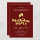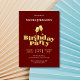 Modern birthday invitation features gold champagne with bold typography text "birthday party" on burgundy background. Personalise the birthday party invites by adding your name and party details.