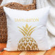 Stylish and trendy glittery gold pineapple on white decorator throw pillow, personalised with your family name.