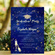 Gold glitter graduation cap, champagne glass, and stars on navy blue background.